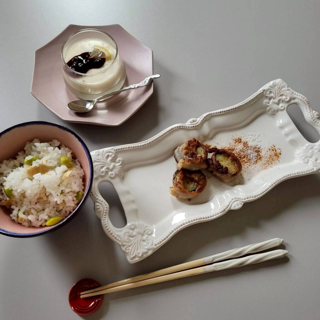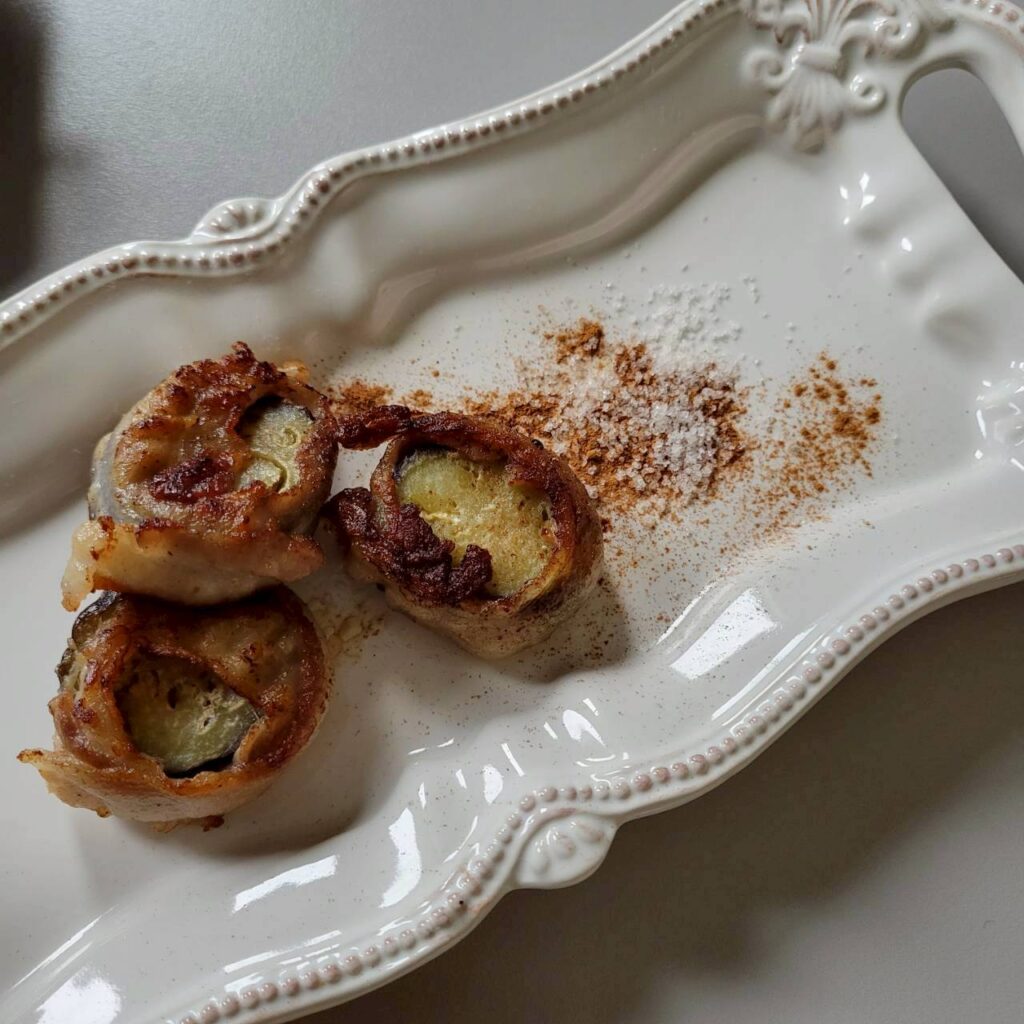- シナモン塩でいただく茄子の豚肉巻き